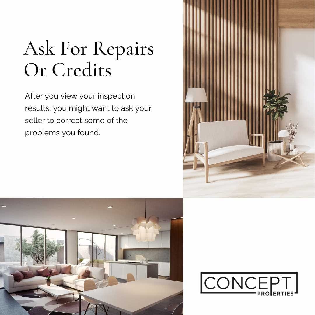 You can do this in one of three ways: – Ask for a discounted purchase price considering the results. – Request that the seller give you credits to cover some of your closing costs. – Ask that the seller have the problems fixed before you close. The seller might accept your request, or they might reject it. If your seller rejects your request, it’s up to you to decide how to proceed. #conceptblog